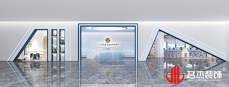 在整個的辦公室裝修設計當中,運用流行的霧霾藍作為整個空間的色調基準,同時還加入各種不規則的圖形,這個在門頭處也能體現出,這些圖形的加入也能讓整個空間變得更加有設計感。點綴空間的同時,還能讓空間更加有層次感。大量的燈光引入,也使得產品展示變得更加有吸引力。