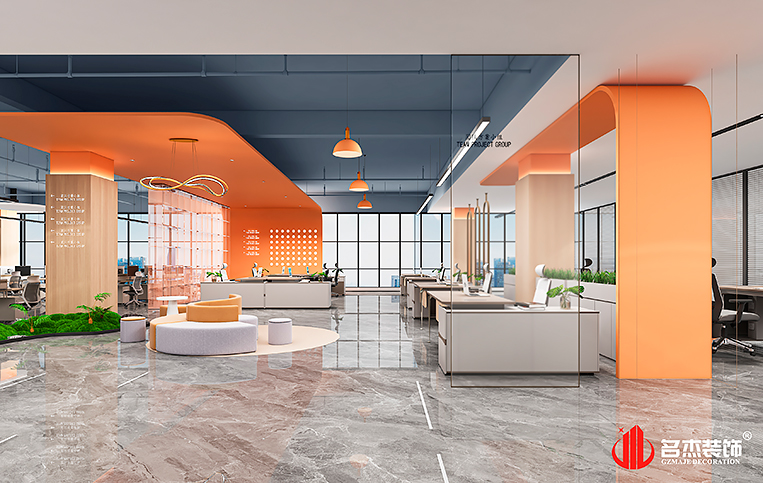 辦公空間的前臺結合天圓地方的設計理念,弧形的背景墻,加上層層堆疊的天花造型,很好的呈現出一個獨特且有品位的集團前臺。而在辦公區域則是選擇使用企業的LOGO色融入到整體設計中,讓其企業氛圍更加濃郁。在高管的辦公室則是采用較為沉穩的設計風格,選擇有質感的材料來定制這些高管辦公室裝修設計空間。#廣州辦公室裝修#