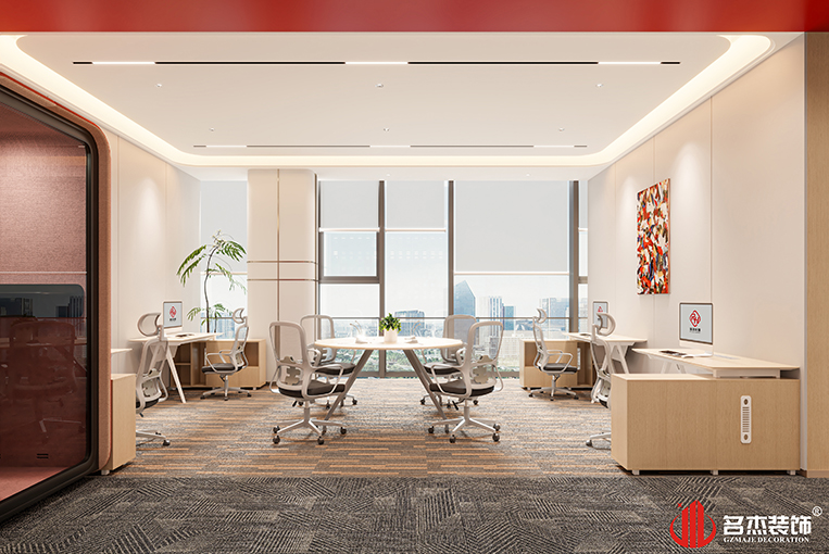 時尚簡約風格是這次設計的主打風格,設計團隊在這個時尚簡約的設計基礎上,大量加入跳色的設計,讓空間具有設計層次感的同時,還能讓來訪的客戶以及員工感受到企業特色設計風格。以搭積木的方式來講辦公區和經理室區域進行分隔,這種非常具有創意的設計也是這次設計的亮點所在。#廣州辦公室裝修設計公司#